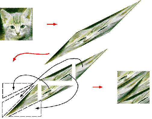 This page gives a rough overview of the transformation known as Arnold's Cat Map. This is a transformation which stretches an image that is composed of n by n pixels and effectively wraps the streched portions around to restore the original dimensions. It is of interest to people doing research in chaos and difference equations because it shows properties that many chaotic systems do. For instance after a certain number of iterations the original image is restored. The Arnold's Cat Map transform is then said to be periodic with the given number of iterations. This interesting transform is shown geometrically in the following image: